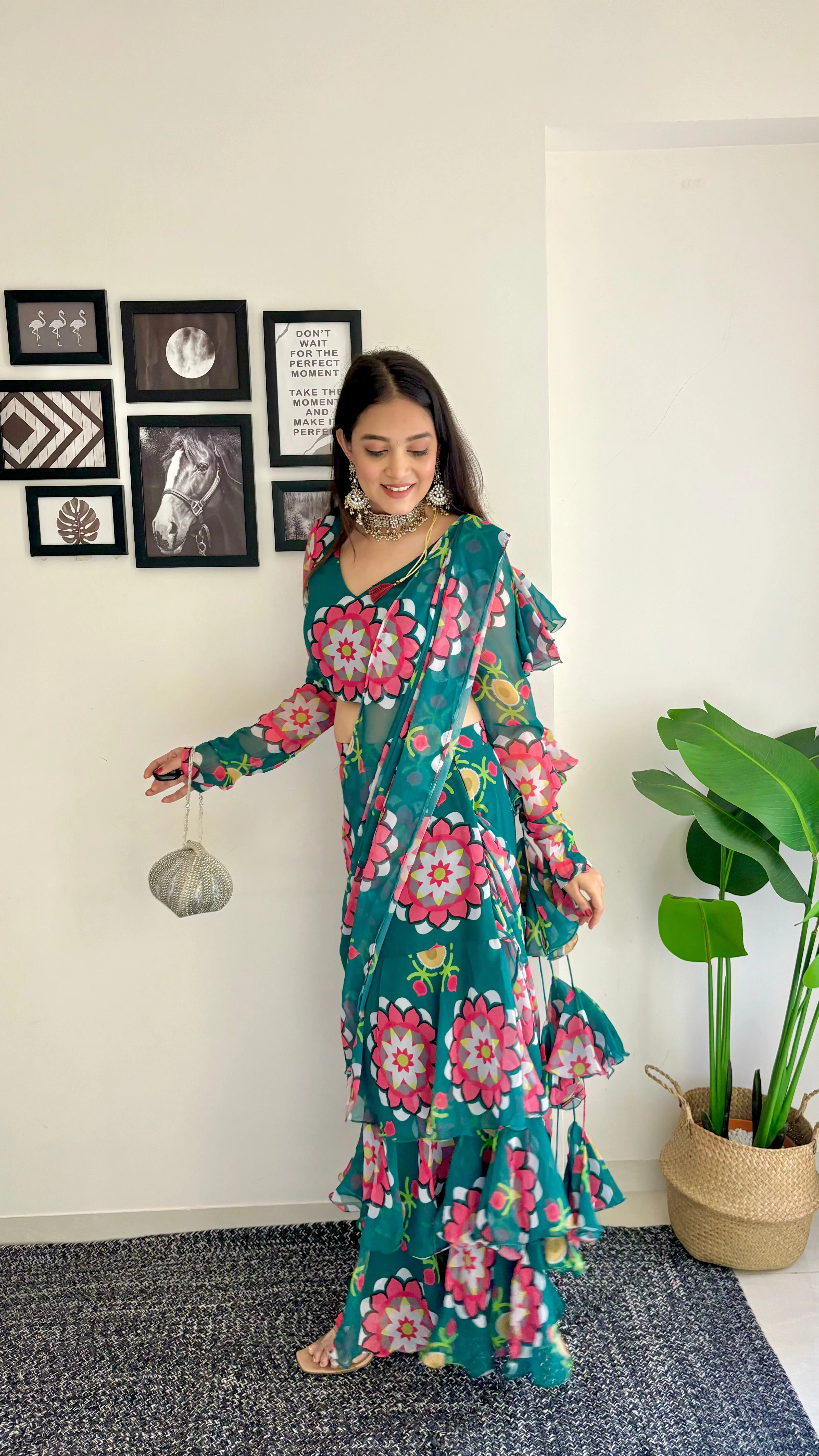 Delight in the charm of nature with the Aurora Bloom ready to wear saree, a stunning outfit where soft, pastel florals meet the rich green of forest hues. The cascading ruffles on the skirt create movement that mimics the flow of petals in the breeze. This ensemble is the definition of elegance, blending whimsical floral patterns with the boldness of sheer fabric for a balanced, dreamy look.