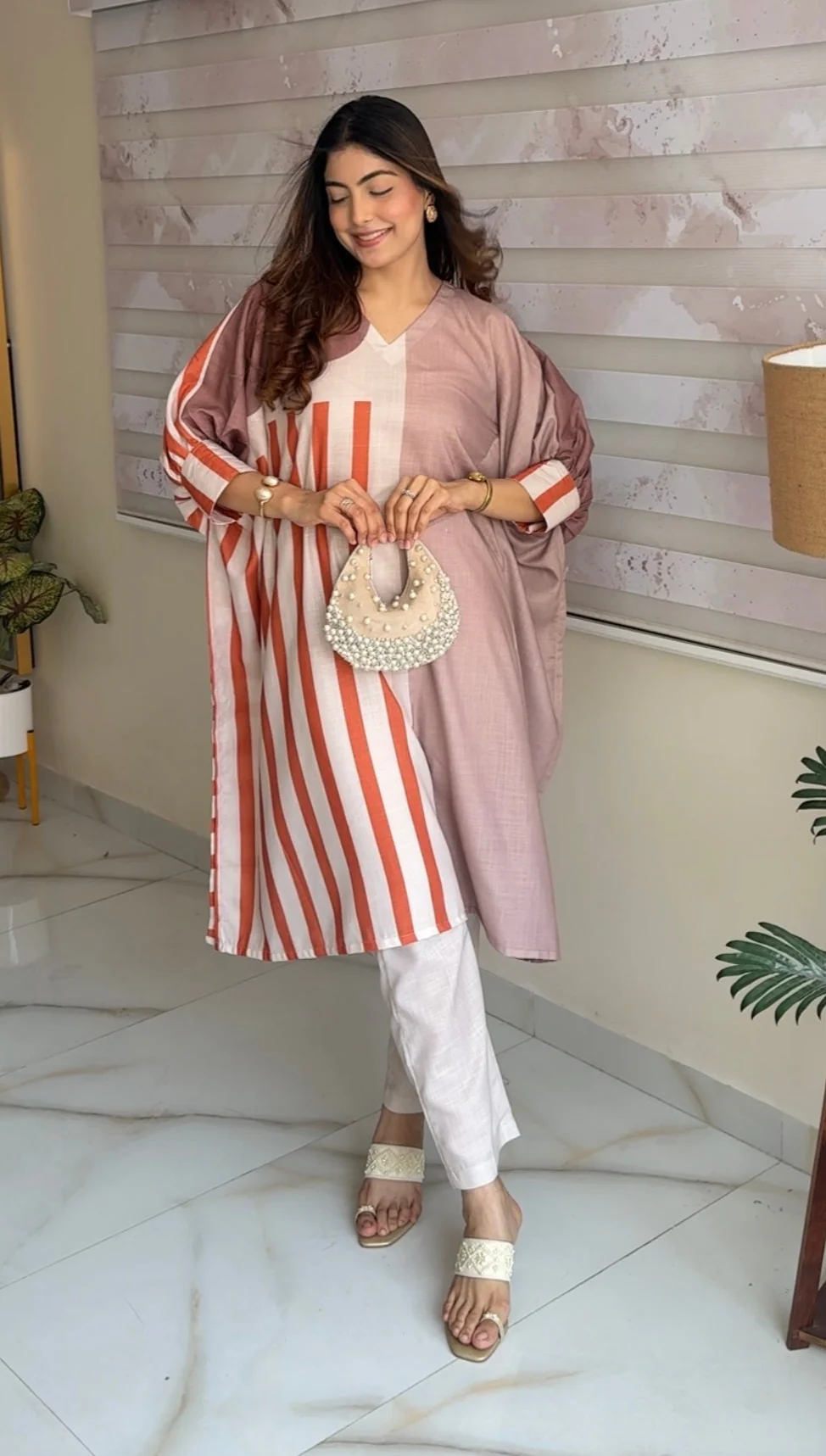 Embrace laid-back elegance with this kaftan-style set in soothing cream, brown, and orange stripe tones. Made from breathable cotton slub fabric, itās perfect for regular wear. The relaxed fit ensures all-day comfort with effortless style.