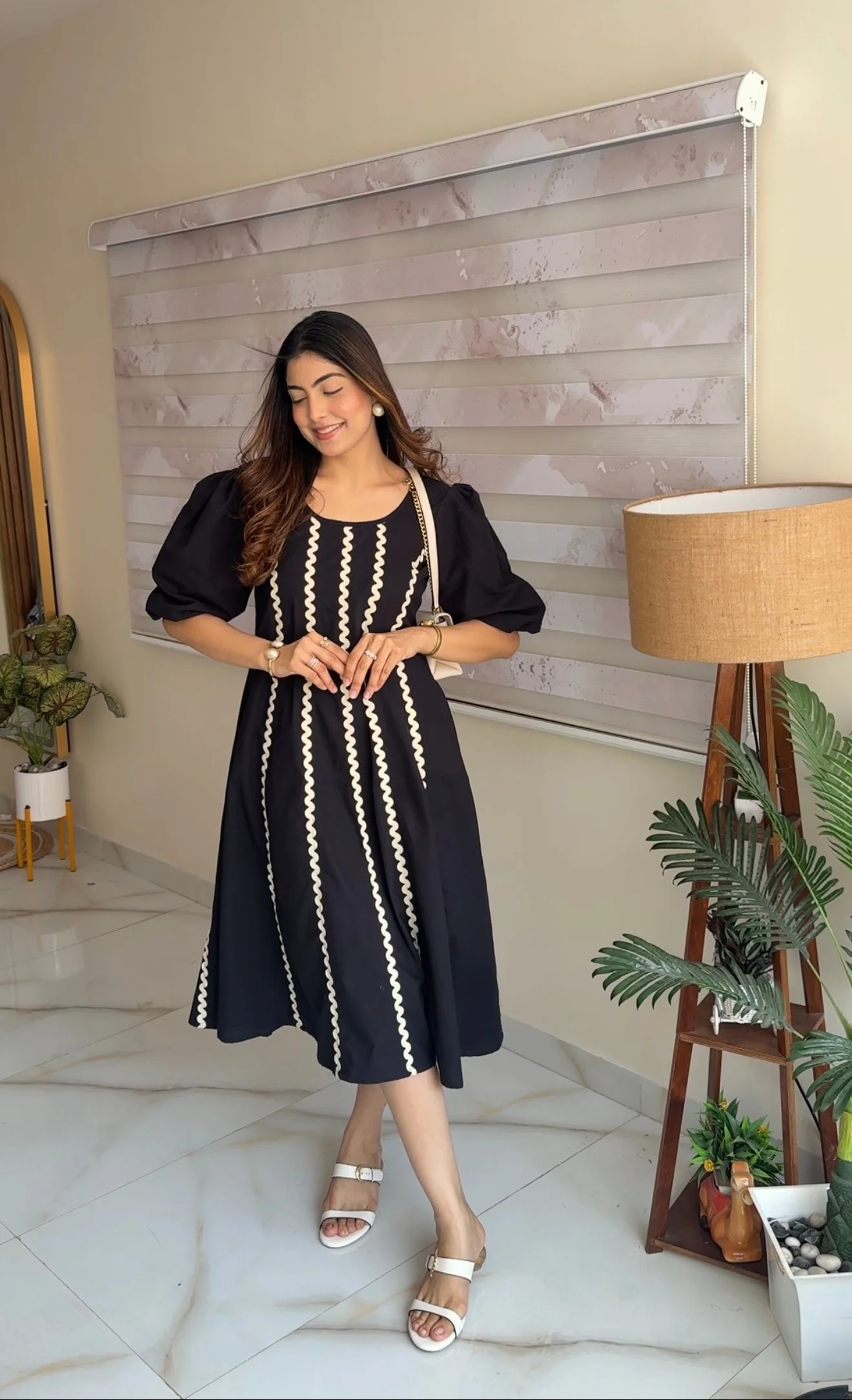 Gracefully crafted in rich black dhabu cotton, this midi dress features intricate wave lace detailing for a soft, elegant touch. Its fluid silhouette transitions effortlessly from office hours to evening soirees. A perfect blend of minimalism and timeless charm..