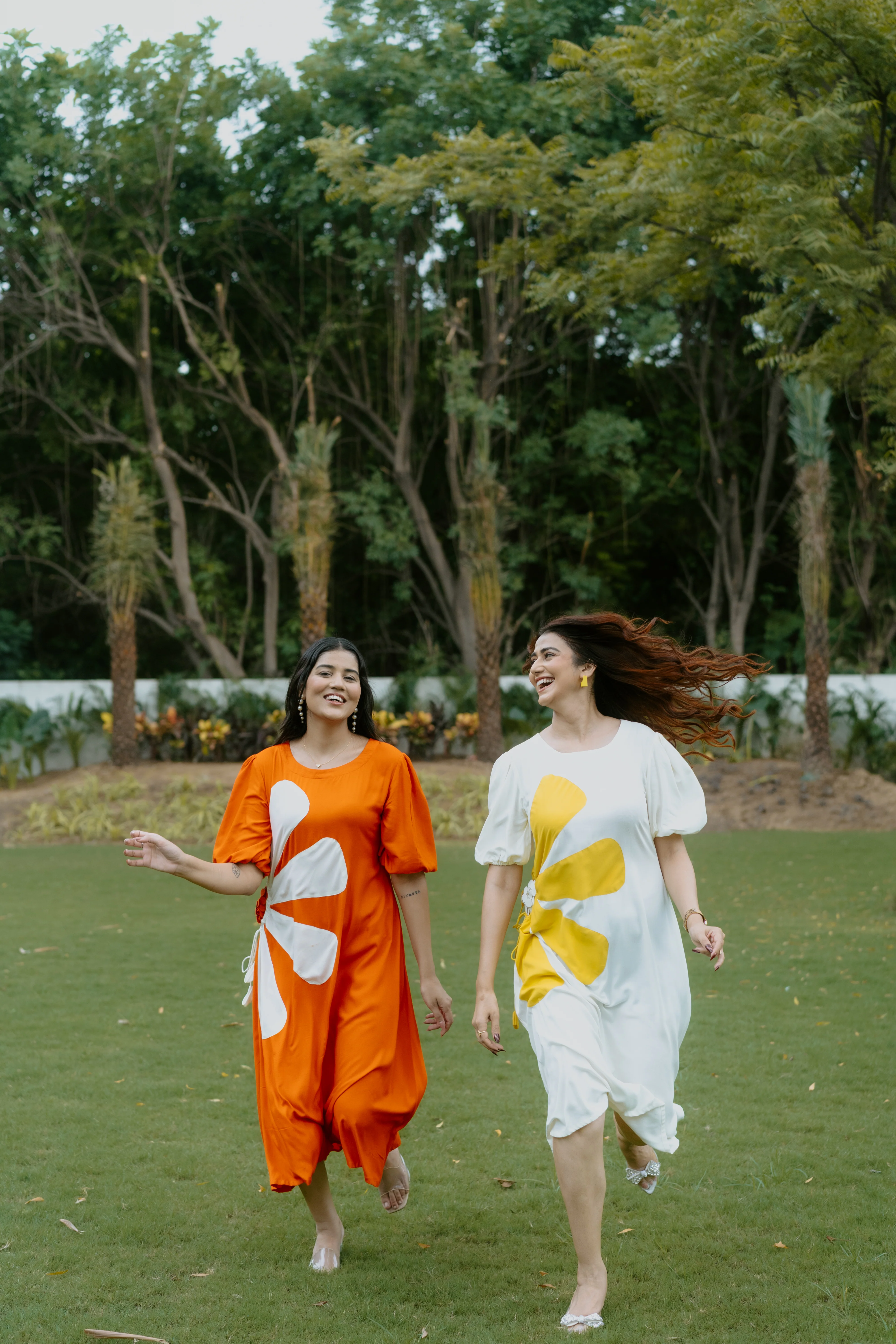 Elevate your vacation or brunch look with this breezy midi dress, adorned with elegant floral patchwork. Choose between two vibrant styles — orange with white flowers or white with yellow flowers. Designed for comfort and charm, it's your go-to outfit for sunny, stylish days.