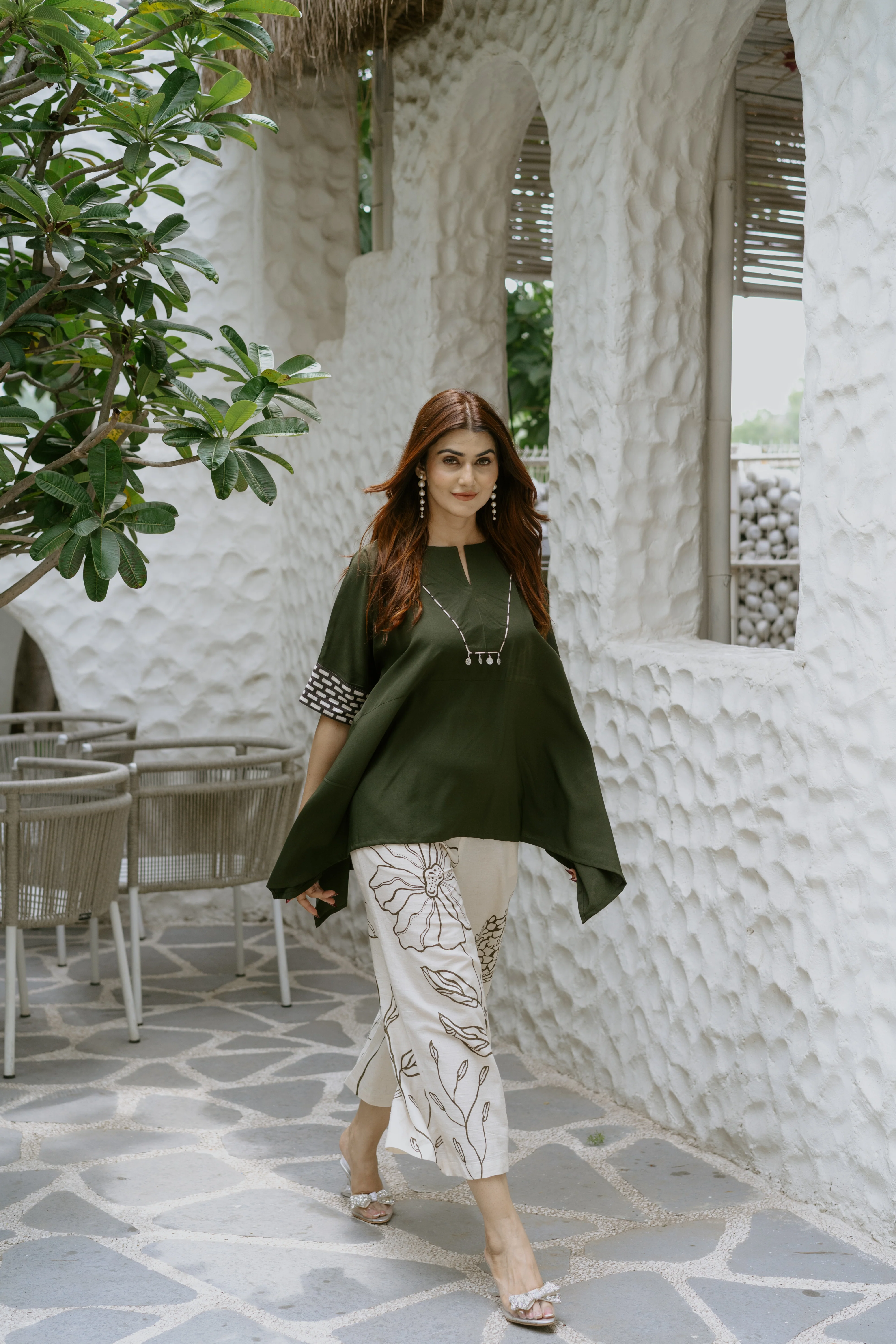 Stay effortlessly stylish in this olive green kaftan co-ord set, featuring a flowy boho-style crap top paired with comfortable linen pants. Perfect for office days, casual outings, or small functions, this set blends ease and elegance in every detail. A must-have for your everyday ethnic-chic wardrobe.