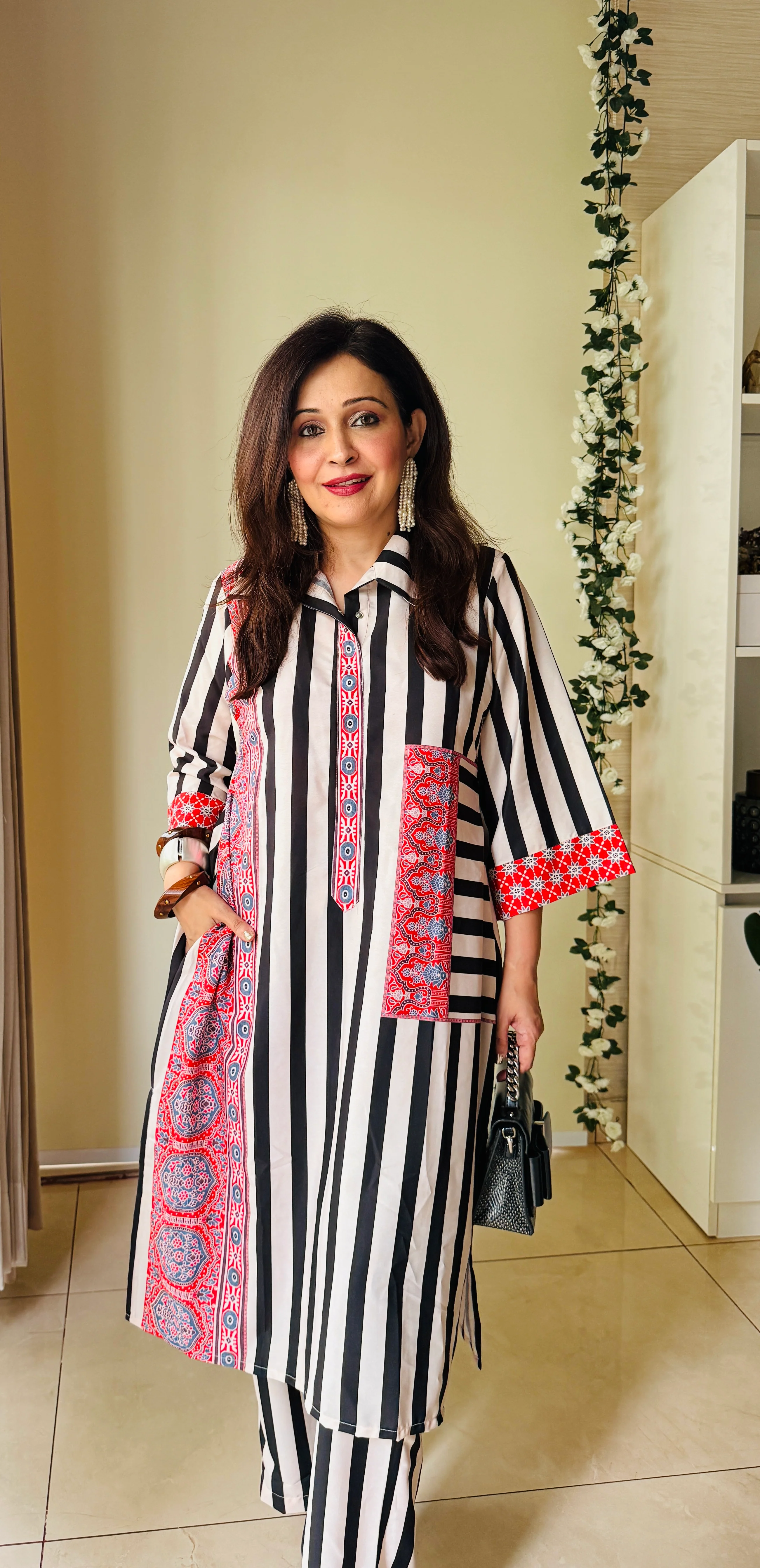 Make a statement in this cream and black muslin co-ord set, adorned with bold red prints. Lightweight and breathable, it’s perfect for party wear, office looks, or any stylish outing. The elegant contrast and flowy silhouette bring effortless charm to your wardrobe.