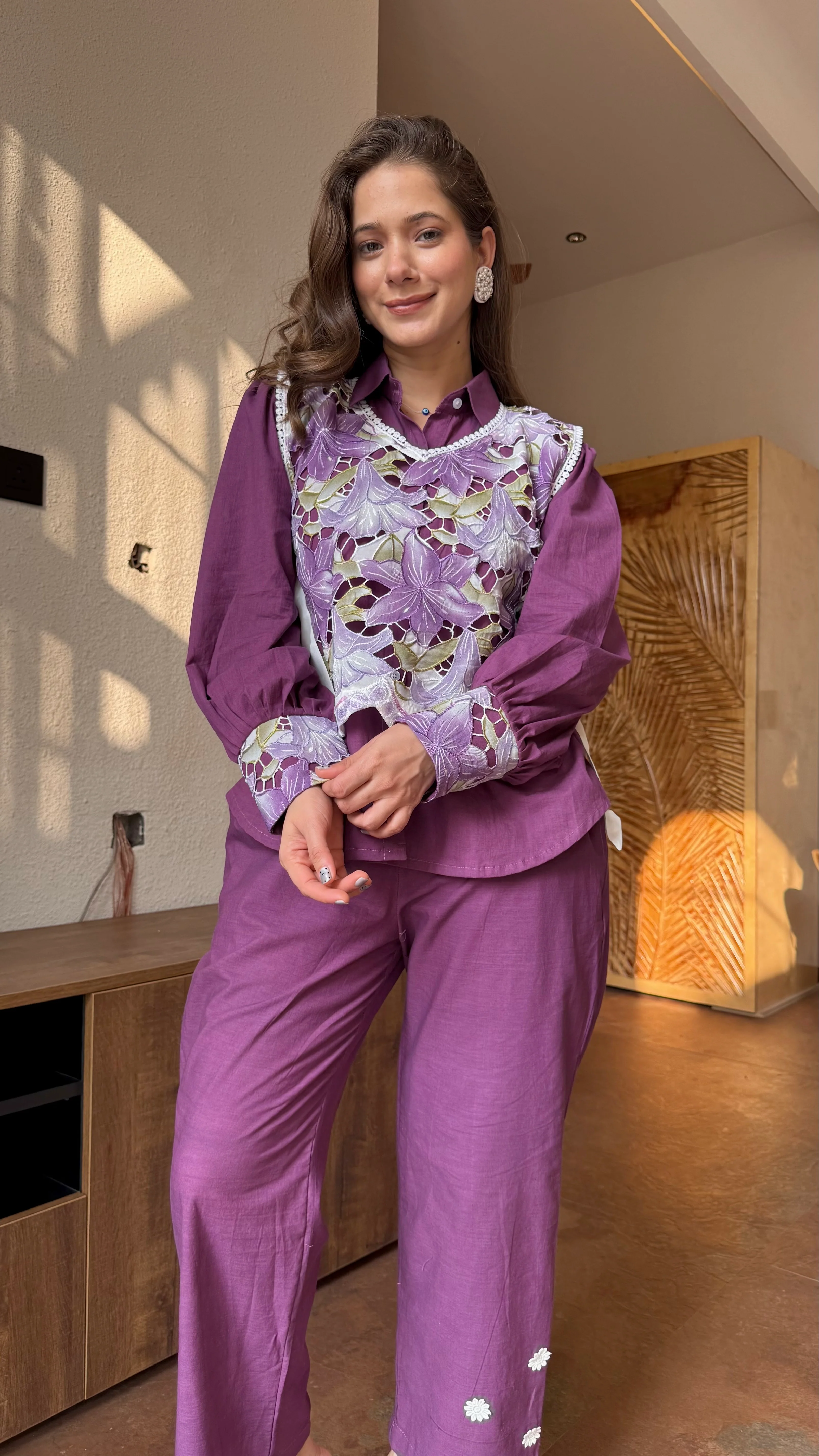 Elevate your everyday elegance with this stunning Cord Set featuring a Premium Cutwork Floral Cape. Crafted in a rich solid hue, the set includes a beautifully tailored shirt and matching straight-fit pants, designed for effortless comfort and refined style.