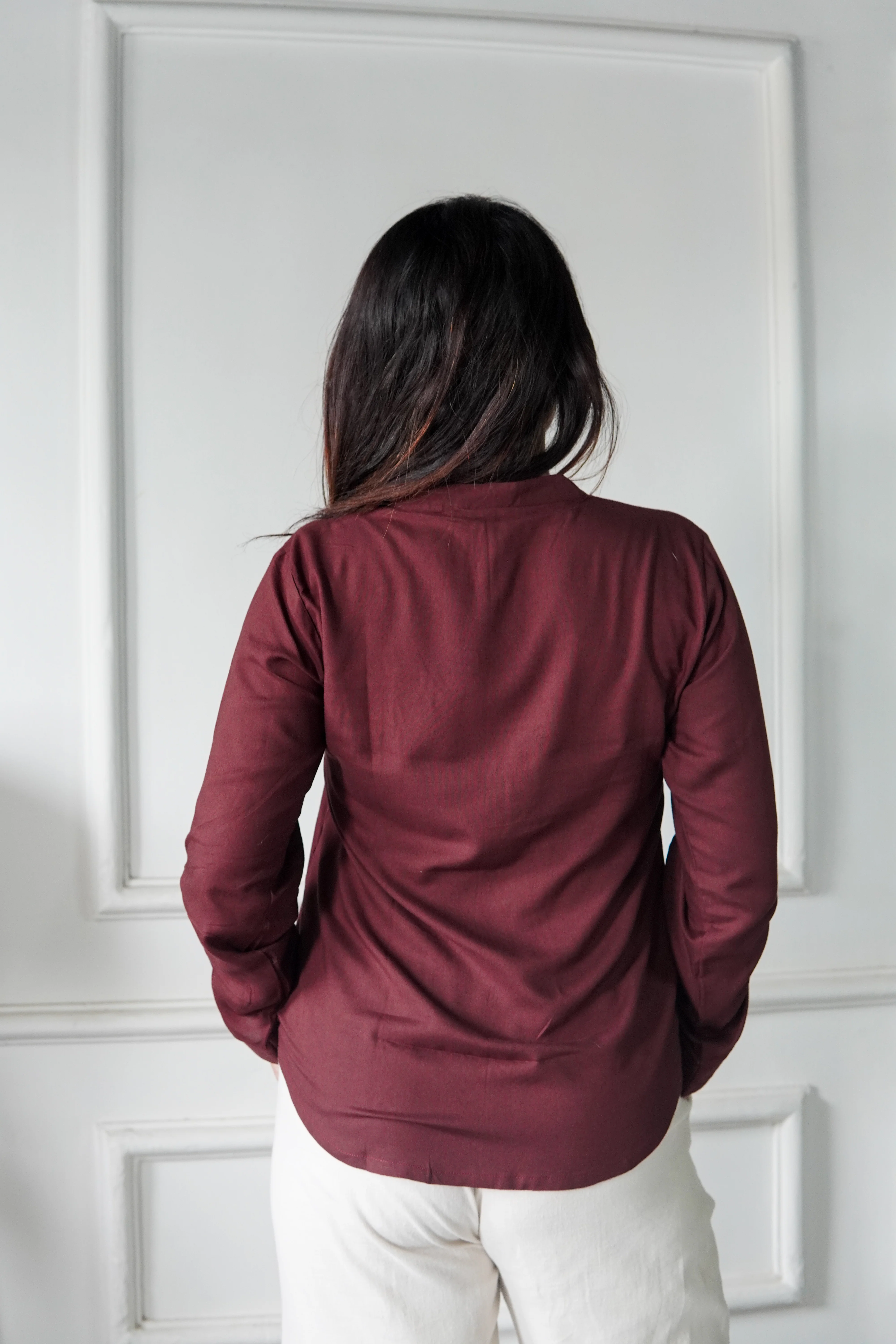 ThisĀ cotton top features a mandarin collar, front pleats for added flair, and square button detailing along the placket and sleeves. Designed with a relaxed fit and full-length sleeves, it offers both comfort and contemporary elegance ā perfect for everyday wear or casual outings.