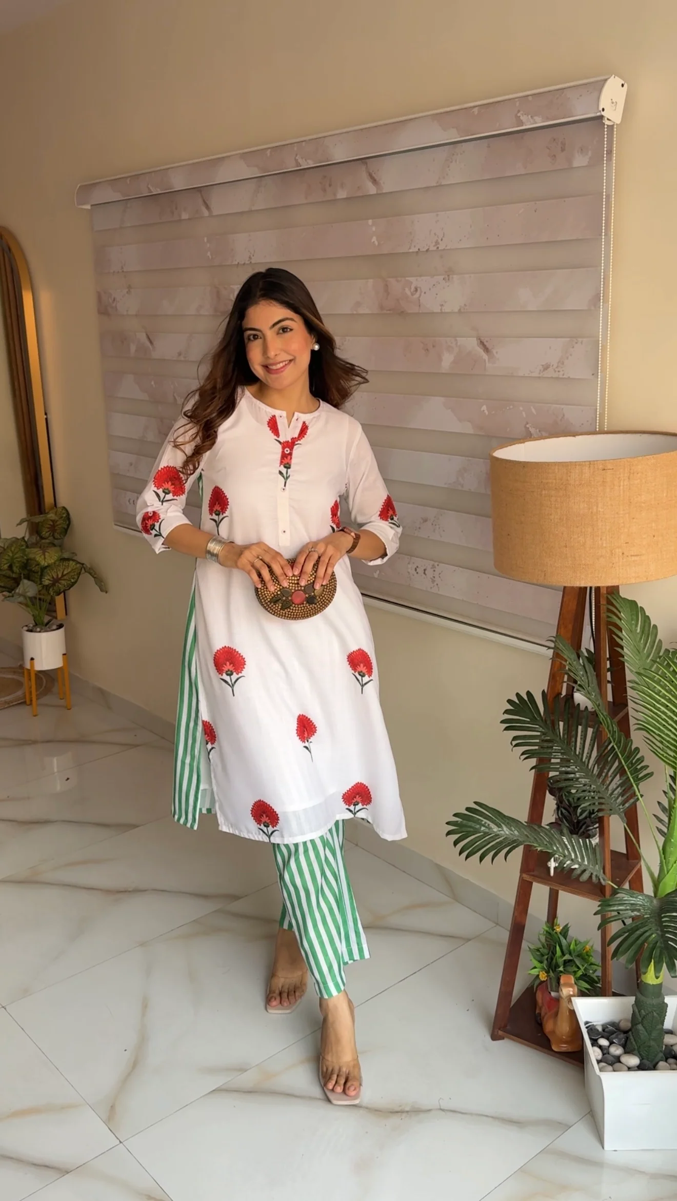 Experience graceful comfort with this white cotton slub kurta and plazo set, adorned with delicate floral prints. Its loose, airy fit makes it perfect for office wear, brunch dates, or casual parties. Light, breathable, and effortlessly stylish