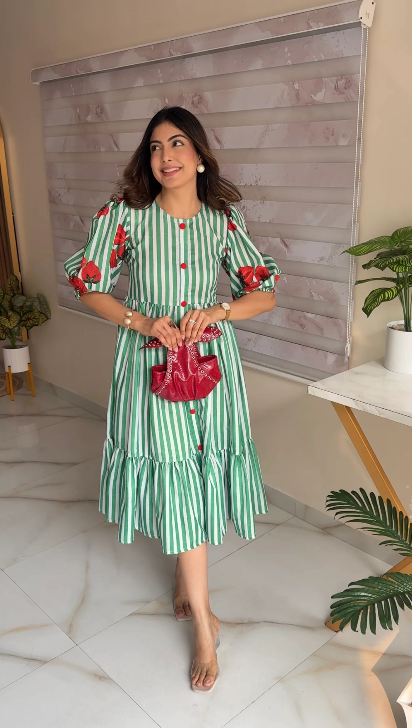 Make every day feel special in the Strawberry Trails Maxi Dress. With its flowy Indian silhouette, subtle stripes, and whimsical strawberry print, it blends elegance with everyday ease. Ideal for office hours, brunch dates, or festive evenings. A sweet twist on classic style.