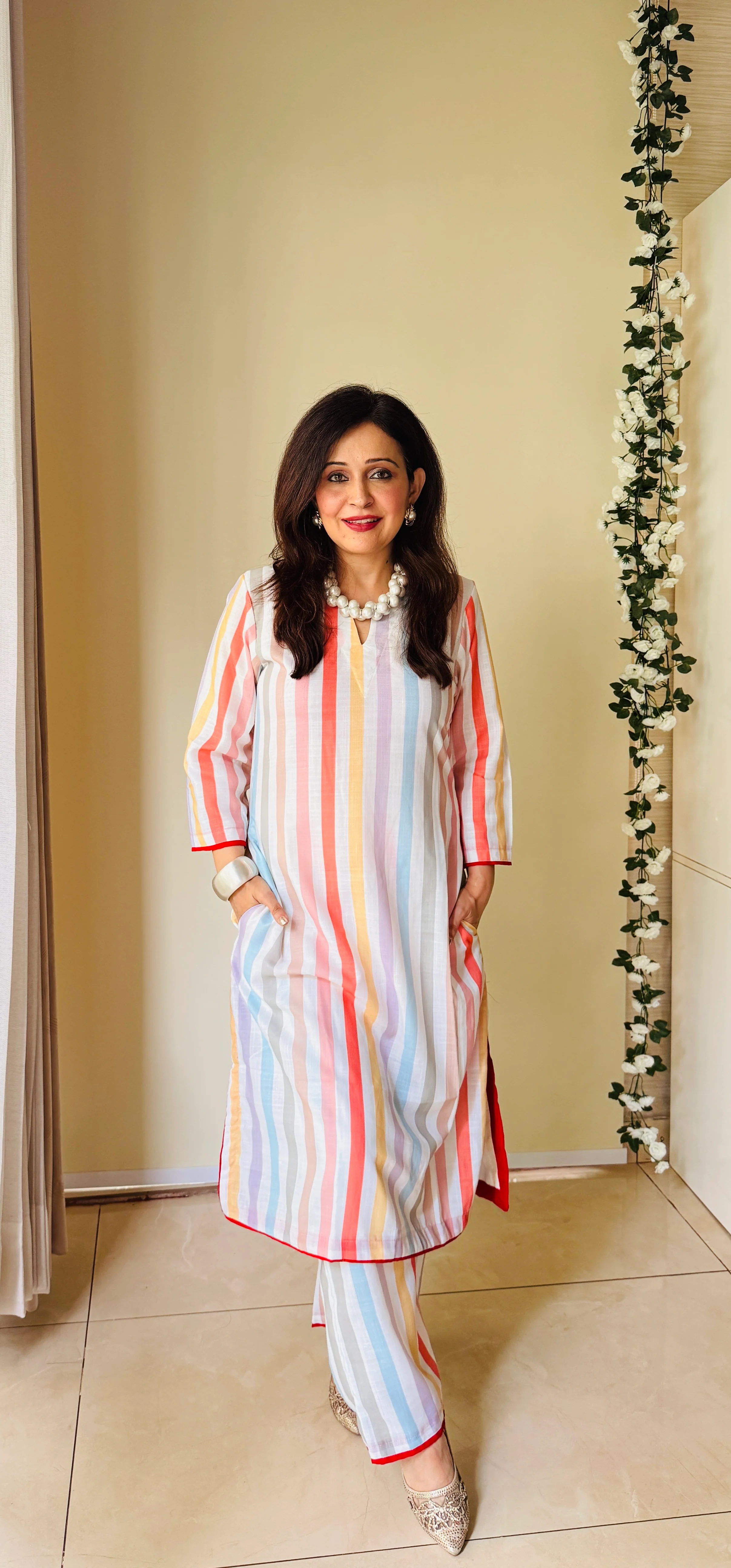 Stay fresh and stylish in this pure cotton white co-ord set, accented with playful colorful stripes. Designed for office wear or everyday comfort, it offers a perfect blend of minimalism and fun. Lightweight, breathable, and effortlessly chic—your go-to outfit for any casual day.