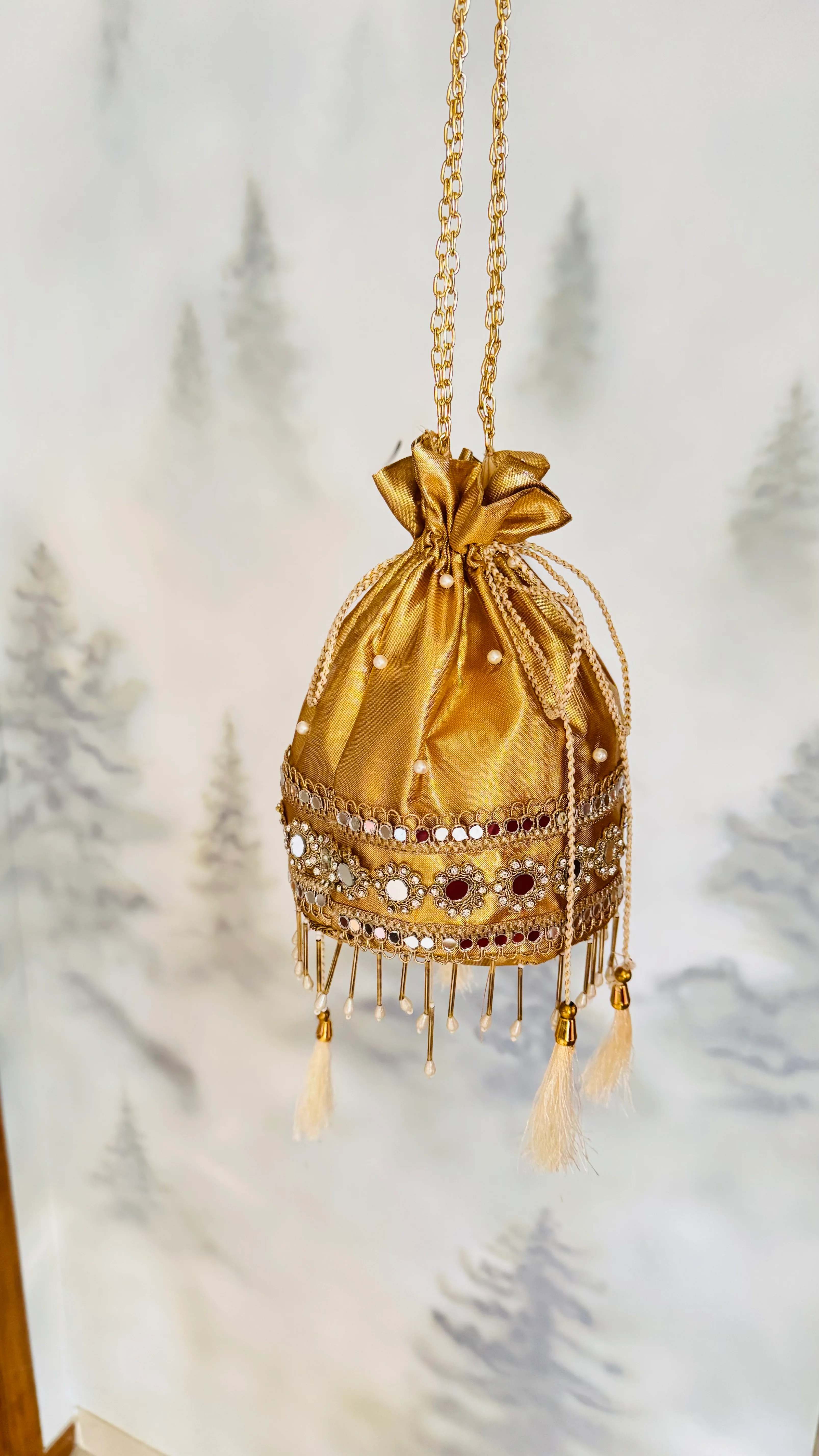 Wrap your ensemble in pure opulence with this handcrafted golden potli, a piece that sparkles with traditional charm and regal finesse. Made from rich, lustrous fabric, it features delicate pearl accents and intricate mirror and stone embellishments that catch the light with every movement.