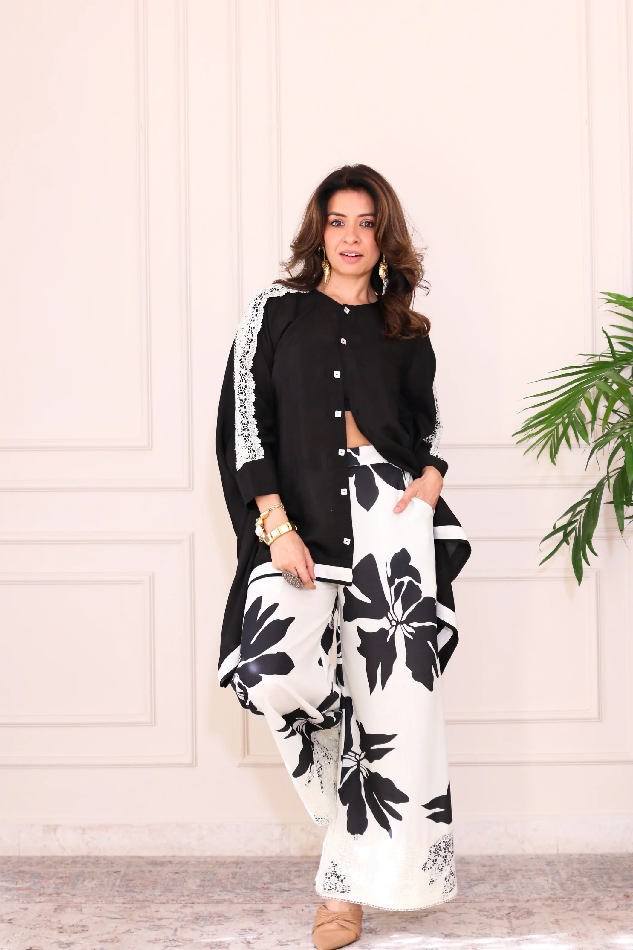 Elevate your style with this elegant white and black kaftan-style top paired with digital print poly linen loose pants. Crafted from premium pure muslin, this set is lightweight, breathable, and perfect for all-day wear. Ideal for brunch, office hours, or casual outings — comfort meets sophistication in every stitch. A must-have versatile outfit for your wardrobe